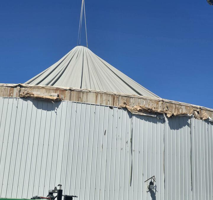 The digester was drained to an adjacent holding lagoon. The roof was removed and the digester cleaned out in 12 days using the crane, clamshell and skid steer. During the cleaning process, it was observed that the gas zone of the inside concrete wall had heavy corrosion damage. Bristola worked with a nationally recognized vendor to supply concrete repair and corrosion-resistant epoxy products. The vendor and Bristola worked collaboratively on a plan and presented this to the customer. The customer agreed to address the problem, and the top 4 feet of the tank were cleaned, repaired and a corrosion-resistant epoxy applied. After the epoxy and concrete repair were finished, Bristola then installed the new roof and mixers. Lastly the retrofitted door was installed and the tank filled for recommissioning.