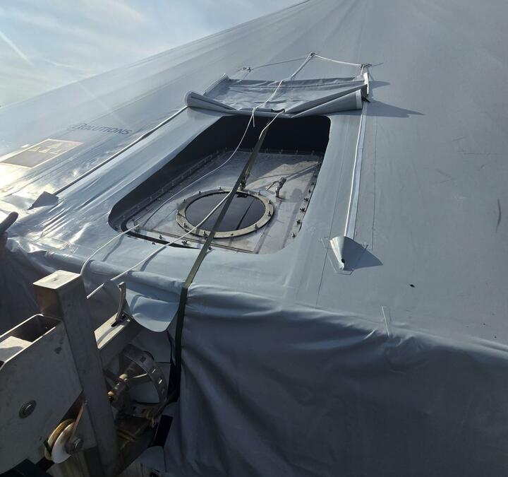 Bristola proposed using a crane, clamshell and skid steer to remove the roof and solids from the tank. At the start of the cleanout process the mixers would be removed and sent out to the customer’s repair shop, with the goal of reinstalling them once the new roof was ready. Bristola would also clean the walls and internal heat loops as part of the cleaning process. Two cranes would then be used to install the roof, and a smaller crane would be mobilized to install the mixers. The crane costs were significant, and swapping cranes would help to save the customer money on the project. Bristola also retrofitted the 4-by-4-foot entry door equipped the new door with a 24-inch pipe and isolation valve. This valve would allow for future live cleanings using the submersible remotely operated vehicle cleaning system.